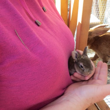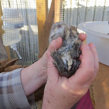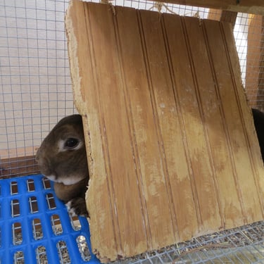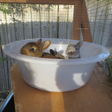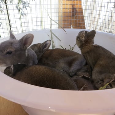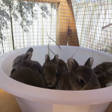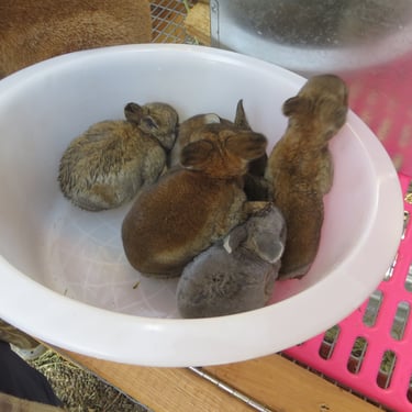 The bunnies are growing and they are starting to jump out of the nest box. After we put out the new dishes, several of the bunnies jumped out of the nest box and into the water. We found the nest box and the bunnies wet that next day.