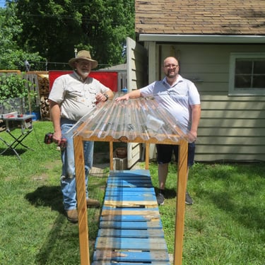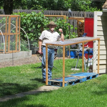 When we were in Branson on vacation, we had put Breanna in charge and told her to make sure she put the can lids on. Well, she is related to her parents and she forgot. Of course, she forgot the day it rained, so we had to dry the hay out again. Martin and Zach made this "roof" so that hopefully when we forget again in the future, our hay can stay dry. We used some of our Cargo Largo pallets for the base to keep the cans out of the mulch/mud.