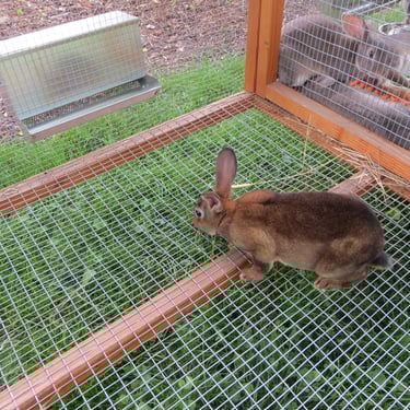 While we were in the grove of weighing rabbits, we decided to move Clove's babies to the rabbit tractor. Her rabbits were 10 weeks old on June 1, 2024. They weighed between 2 pounds 12 ounces and 3 pounds 1 ounce. We think that we have 5 does: caster, lighter caster, black booted, broken black, and broken caster and one buck: blue self. Evidently self is the most rare, so we will likely keep ahold of this buck for a while as well.
